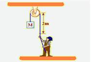 Um homem mantém em equilíbrio estático um bloco preso a uma corda de densidade linear igual a 0,01kg/m, conforme a figura. Determine a massa M do bloco, sabendo que as frequências de duas harmônicas consecutivas de uma onda estacionária no trecho