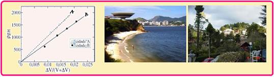 c) Os resultados obtidos nos itens a) e b) sugerem uma experiência simples, capaz de obter a pressão atmosférica local po, através da medida das quantidades H, V e ∆V. O gráfico abaixo mostra os resultados obtidos nessas experiências quando feitas em duas cidades A e