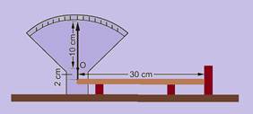 Nessa montagem, uma barra de alumínio com 30 cm de comprimento está apoiada sobre dois suportes, tendo uma extremidade presa ao ponto inferior do ponteiro indicador e a outra encostada num anteparo fixo. O ponteiro pode girar livremente em torno do ponto O, sendo que o comprimento de sua parte superior é 10 cm e, o da inferior, 2 cm. Se a barra de alumínio, inicialmente à temperatura de 25oC , for aquecida a 225oC, o deslocamento da extremidade superior do ponteiro será, aproximadamente, de