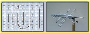 a) Um tipo de antena usada na recepção do sinal é a log-periódica, representada na figura abaixo, na qual o comprimento das hastes metálicas de uma extremidade à outra, L , é variável. A maior eficiência de recepção é obtida quando L é cerca de meio comprimento de onda da onda eletromagnética que transmite o sinal no ar ( L ≈ λ/2 ). Encontre a menor frequência que a antena ilustrada na figura consegue sintonizar de forma eficiente, e marque na figura a haste correspondente.
