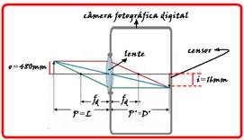 b) Agora trata-se de uma câmera fotográfica digital onde a imagem formada no censor tem altura i= -16mm (negativa porque a imagem para ser projetada deve ser real e invertida) e a distância do objeto à lente continua a mesma, ou seja P=L= 1050mm ---