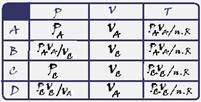 VB=VC=V) --- do trecho AB --- PA.VA=PB.VB (II) --- do trecho BC (III) --- VB=VC --- (III) em (II) --- PA.VA=PB.VC --- PB=PA.VA/VC --- P= PA.VA/VC; V=VC e T= PA.VA/nR (de I) --- terceira linha --- isotérmica --- TC=TD --- equação dos gases ideais --- PC.VC=nRTC --- TC=PC.VC/nR --- P=PC; V=VC e T= PC.VC/nR --- quarta linha --- analogamente --- P=PC.VC/VA, V=VA e T= PC.VC/nR.