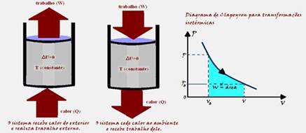 de energia interna (ΔU) do sistema será nula --- ΔU=0 --- ΔU= Q – W --- 0=Q – W --- Q=W --- portanto em toda transformação isotérmica todo calor Q recebido pelo sistema ou cedido por ele é transformado em trabalho W.