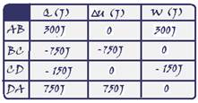 ΔU=Q ---ΔU= -750J --- Q= - 750J --- terceira linha --- isotérmica --- ∆U=0 --- Q=W --- W = -150J --- Q= - 150J --- quarta linha --- isocórica --- W=0 --- ∆U=Q --- Q=750J --- ∆U=750J.
