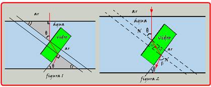 vidro vale θ --- observe na figura 2 que o ângulo de refração na interface água-vidro é φ e na interface vidro-ar, o ângulo de incidência é φ e o de refração é β --- lei de Snell-Descartes na interface água-vidro --- nágua.senθ = nvidro.senφ --- lei de Snell-Descartes na interface vidro-ar ---nvidro.senφ = nar.senβ --- nvidro.senφ = 1.senβ --- ângulo limite (L) para que ocorra reflexão total na interface vidro-ar --- senL=senφ=nmenor/nmaior=nar/nvidro=1/nvidro --- senφ=1/nvidro --- nvidro.1/nvidro = 1.senβ (II) --- senβ=1 (IV) --- β=45o --- nágua.senθc = nvidro.senφ (I)=nar.senβ=1 --- nágua.senθc=1 --- nágua=1/senθc.
