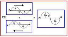 No instante t=0, as duas ondas estão exatamente superpostas e a onda resultante dessa superposição tem amplitude 2A.(interferência construtiva).