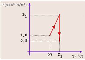 mantendo-se, porém, a temperatura constante (T2=T1, ver gráfico). Sabendo que, ao final do segundo processo, a pressão do gás no interior do reservatório é P2=0,900.105N/m2, o valor de T2, em oC, é