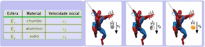 Três pequenas esferas, E1, E2 e E3, são lançadas em um mesmo instante, de uma mesma altura, verticalmente para o