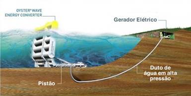 a água do mar, há uma bóia circular. Conforme as ondas batem, a estrutura sobe e desce. O movimento contínuo dos flutuadores aciona bombas hidráulicas, promovendo um ambiente de alta pressão. A água, ejetada a altíssima pressão, faz a turbina girar. Fazendo uma analogia com uma usina hidrelétrica, em vez de termos uma queda d’água, temos isso de forma concentrada em dispositivos relativamente pequenos, onde a pressão simula cascatas extremas de aproximadamente 400 metros, a depender da intensidade das ondas. (PAÍS começa..., 2012).