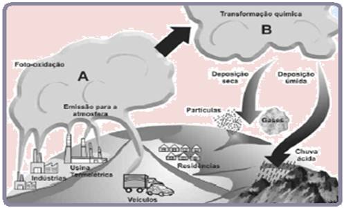 a) identifique, em A, dois óxidos que se destacam e, em B, os ácidos que geram a chuva ácida, originados na