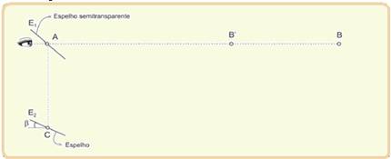 Com o objeto em um ponto B específico, o ângulo β foi ajustado em 44º, para que os raios cheguem ao olho do observador paralelos e superpostos. Nessa condição,