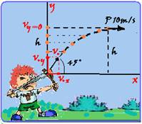 03- Voy=Vo.cos45o=10.√2.√2/2=10m/s --- Vox=Vo.cos45o=10.√2.√2/2=10m/s=Vx=constante em toda trajetória x --- a altura máxima ocorre quando Vy=0 --- equação de Torricelli no eixo y (lançamento vertical para cima) --- Vy2=Voy2 + 2.(-g).h --- 02=102 – 2.10.h --- h=5m (altura máxima) --- nessa altura, a energia potencial gravitacional tem valor