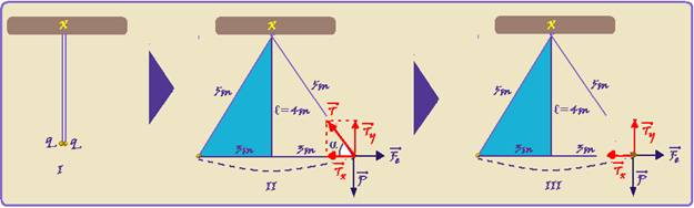 03- As cargas q devem ter mesmo sinal (por exemplo, positivas), pois devem se repelir --- observe na figura (II) que o triângulo hachurado é retângulo, então ℓ=4m --- as forças foram colocadas na carga da direita (figura III) e a tração T decomposta em Tx=Tcosα=T.3/5 --- Tx=0,6T, e Ty=Tsenα=T.4/5 --- Ty=0,8T --- P=1N --- Fe=kq.q/d2=9.109.q2/36