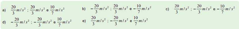 a) 0 e 10 segundos ; 1m /s2 b) 20 e 30 segundos ; 0,5m/s2 c) 30 e 40 segundos ; 0,75m/s2
